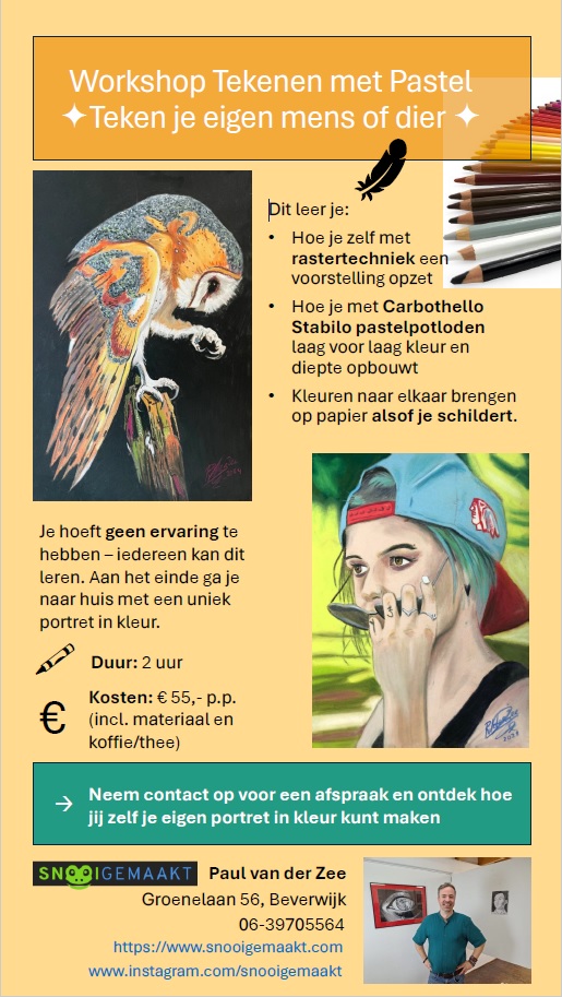 Je hoeft geen ervaring te hebben – iedereen kan dit leren. Aan het einde ga je naar huis met een uniek portret in kleur.